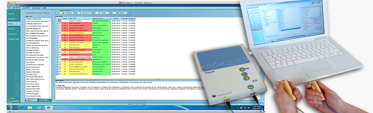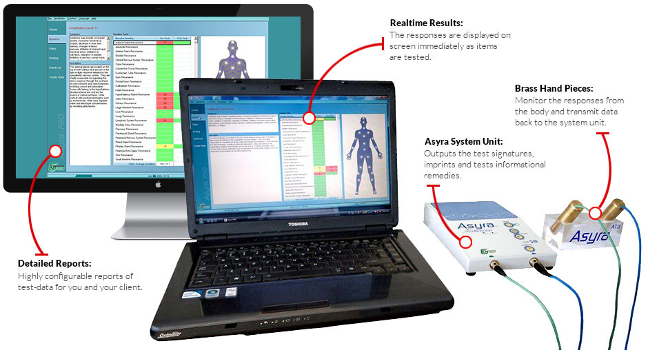 The Asyra software contains digitally-encoded information relating to a wide range of mental, physiological and emotional factors. The signals are output by the Asyra hardware as electromagnetic signals during testing. Using a simple and safe low voltage circuit formed by holding two brass cylinders, the response of the body to those signals is recorded. The response being measured is small changes in the electrical resistance of the skin. This information is relayed back to the software. A report is generated on the computer of any responses that are outside specific limits.